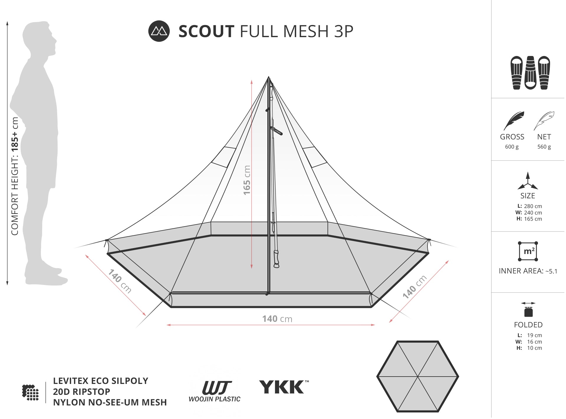 | Weight | 560 g net / ~600 g with guylines & stuff sack |